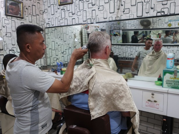 Og så var det tid at blive klippet igen. Peter fik lidt hurtigt peget på et billede i “frisørsalonen” af en mand, der var særdeles tætbarberet i siderne, så de sidste par uger er der blevet brugt ekstra meget solcreme for at skåne den jomfruelige hud over Peters ører.