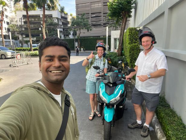 Da vi lettede fra CPH mandag, troede vi, at vi havde styr på leje af motorcykel i Bangkok, men sådan forholdt det sig ikke helt. Efter gennem WhatsApp at have tæppebombet samtlige telefonnumre i Bangkok og omegn, der nogensinde har haft relation til udlejning af motorcykler, lykkedes det efter et par timer at få lavet en aftale om leje af et turkisfarvet lyn af ældre dato. Bangkok er en STOR by, så hvis man ikke har lyst til at bruge halvdelen af sin tid i en taxa, der hænger i trafikken, så er en motorcykel helt nødvendig.