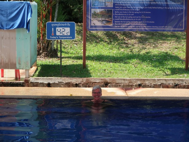 Her er Camilla kommet i blød. 42 grader er VIRKELIG varmt. Specielt når man i forvejen kører rundt i 32 grader på motorcykel. Vi ville have foretrukket cold springs om muligt.