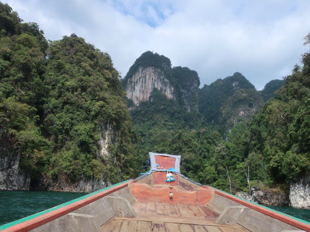 I Khao Sok Nanalpark ligger en kunstigt skabt sø, som følge af bygning af et hydroelektrisk værks dæmning. Vi købte en to timers bådtur i den smukke “vandpark”. Et sandt turisthelvede, men meget smukt. Vi betalte 2200 THB (440 dkr) for en privat båd.