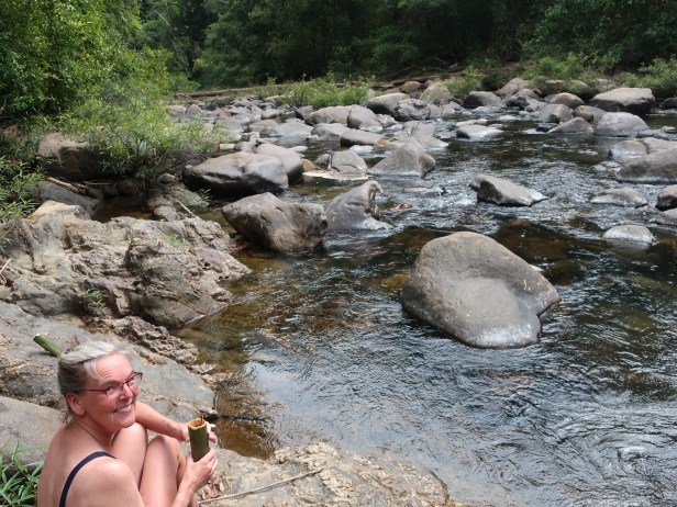 På trods af de mange km i uvejsomt terræn gennem nationalparkens regnskov, var der også tid til en frokostpause ved en pool neden for et vandfald. Her sørgede vores guide for fried ris med kylling og ananas samt sticky rice med mango til dessert. Hele menuen blev afsluttet med te kogt i bambusrør over bål. What’s not to like?