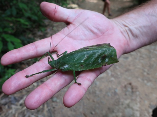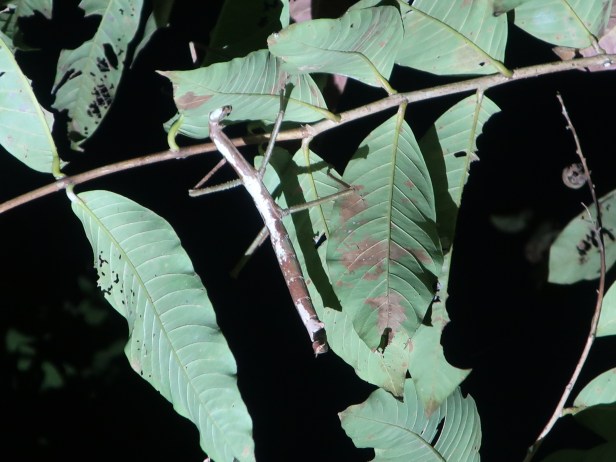 Vi så forskellige vandrende pinde, men denne på ca. 25 cm og med fine nuancer af brun skilte sig ud i forhold til den meget flotte lysegrønne bladfarve, som de fleste har.