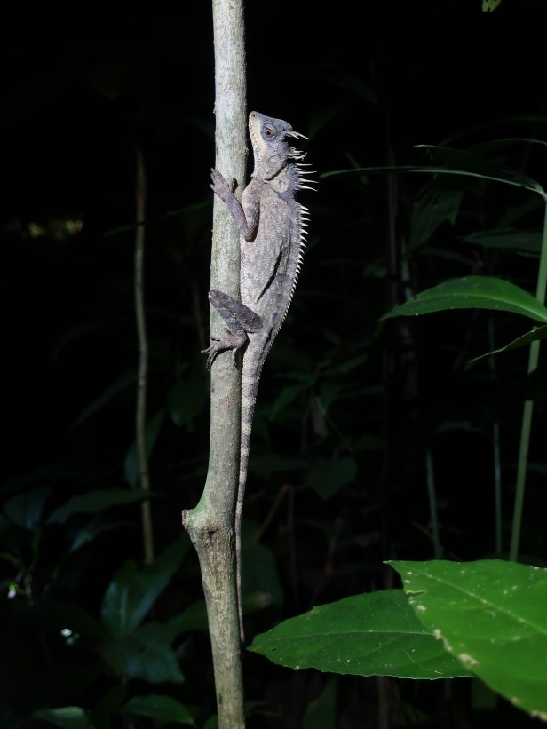 Disse små kamæleoner så vi flere af på vores nattrek. De er mægtig fine med deres stive “børster” på ryggen. De føles som at røre ved tænderne på en kam.