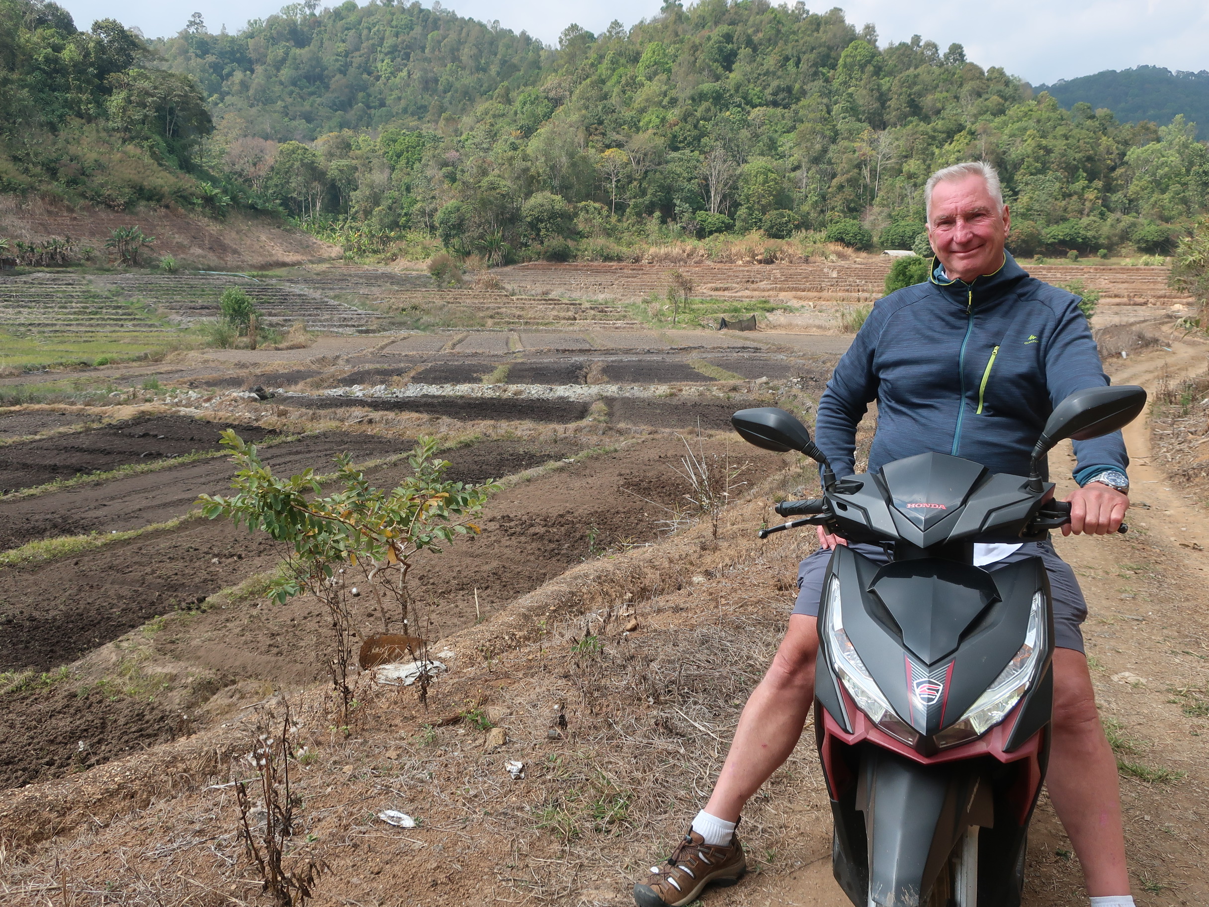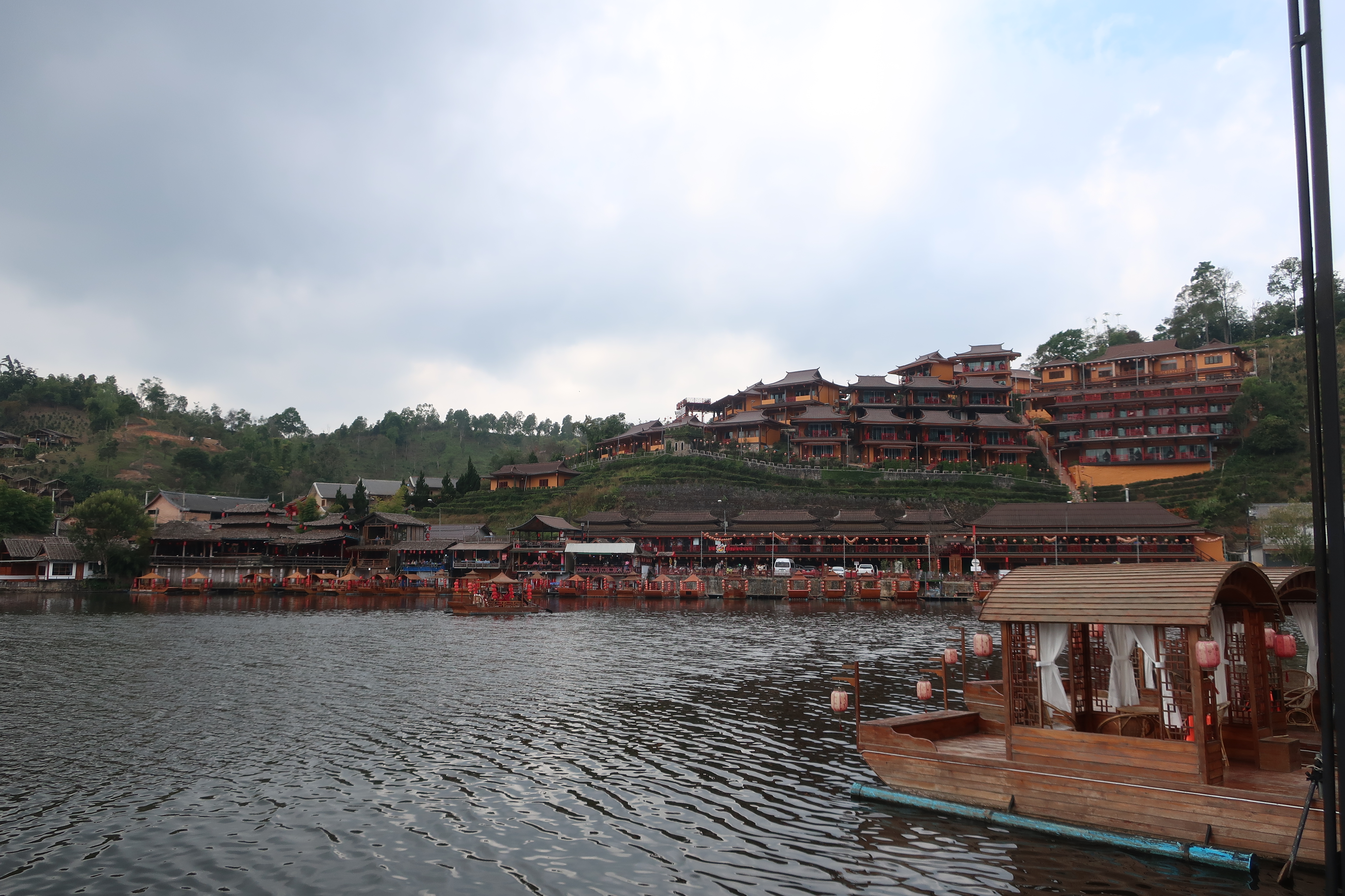 Ban Rak Thai ligger relativt højt, og selv midt på dagen var en trøje en god idé. Læg mærke til alle de fine marker til venstre.