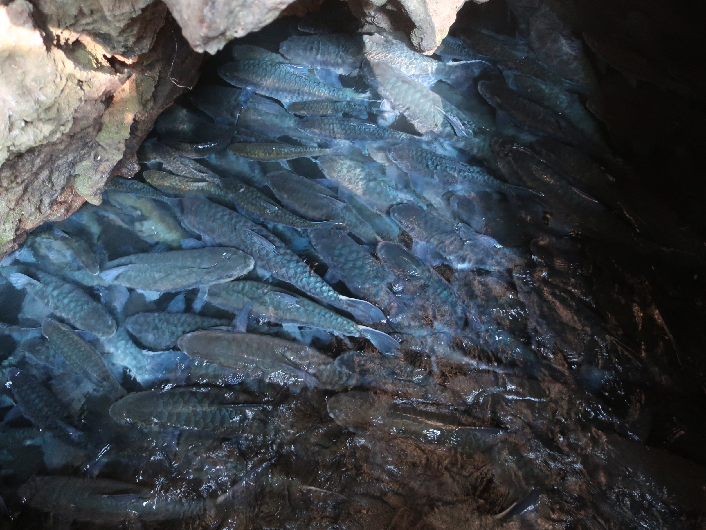 Ban Rak Thai ligger 60 km fra vores hotel, så på vejen hjem var et stop nødvendigt for at rette bagdelen ud igen. Vi valgte derfor at holde et hvil ved nogle grotter, hvor der levede en del blåfinnede karper i en underjordisk flod.