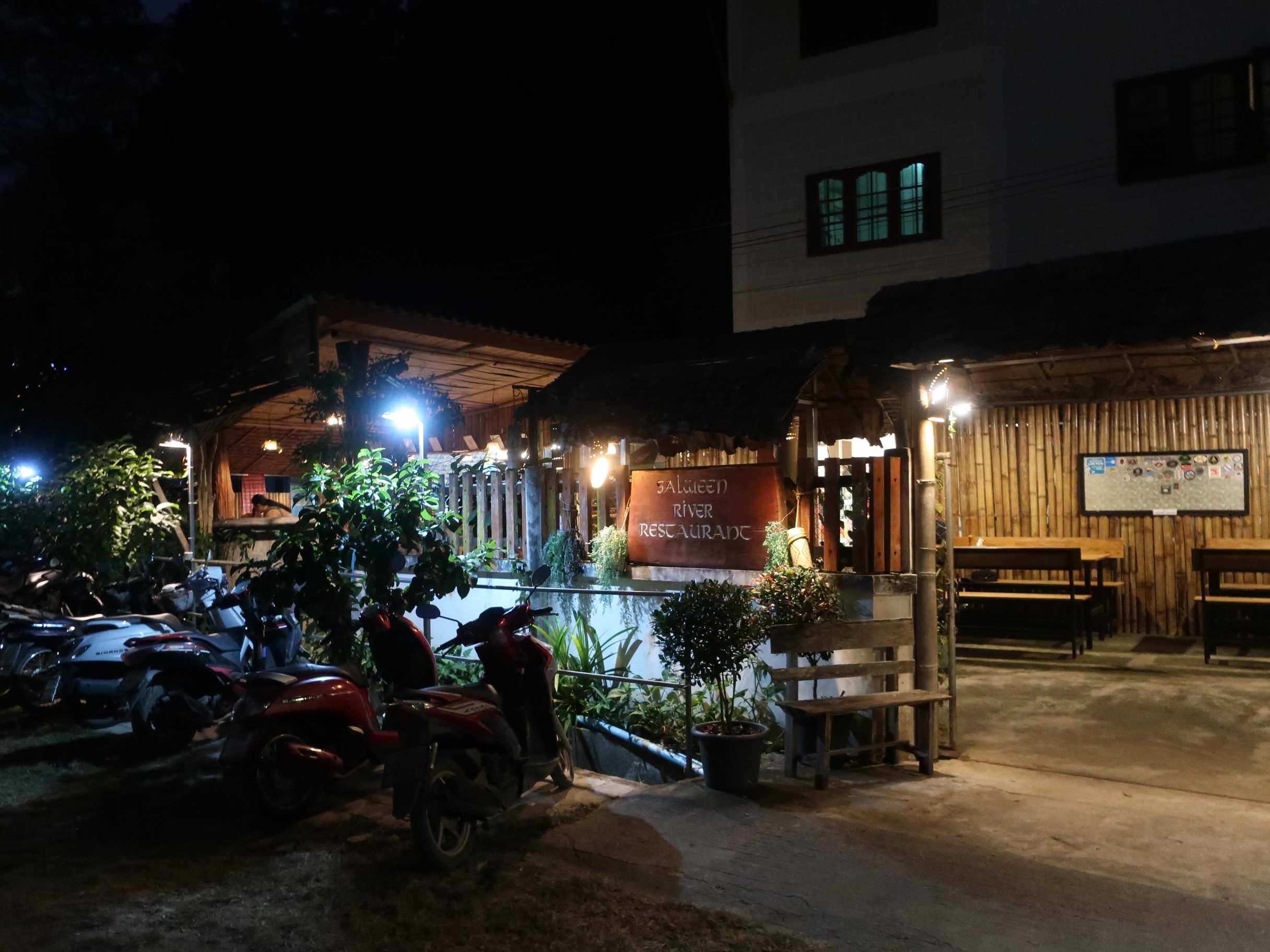 Til sidst får I et hyggeligt stemningsbillede af facaden på vores yndlingsrestaurant i Mae Hong Son, Salween River Restaurant. Den ser måske ikke af så meget, men alle borde er solgt mindst en gang hver eneste aften på trods af, at restauranten ligger nogle km udenfor centrum. Maden er simpelthen SÅ god, og personalet har 100% styr på alt & taler perfekt engelsk.