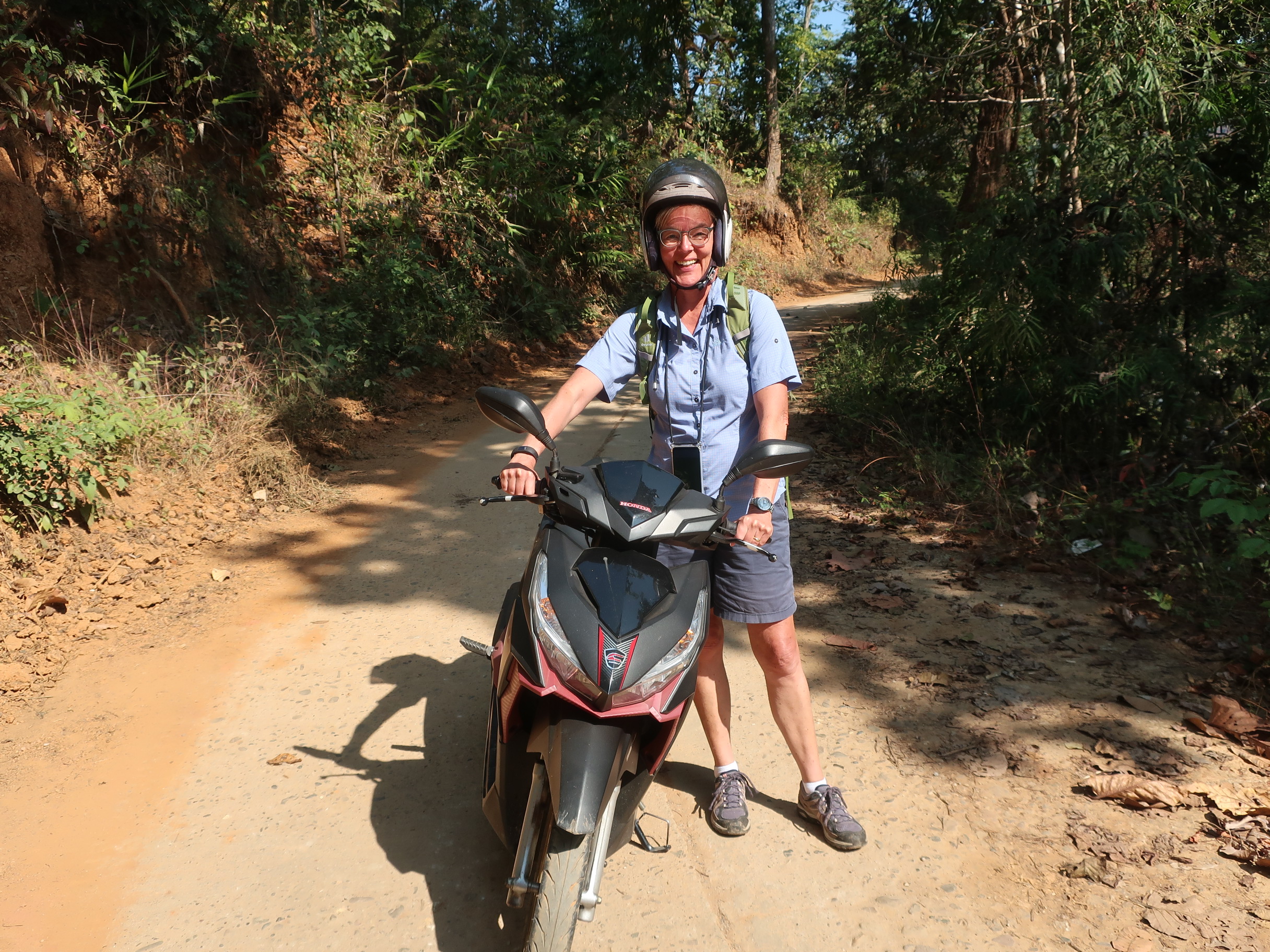 Vi havde aldrig fundet den helt rigtige Kayan-landsby, hvis det ikke var for Camilla, som tog styringen på motorcyklen. Læg mærke til støttebenet 🙂