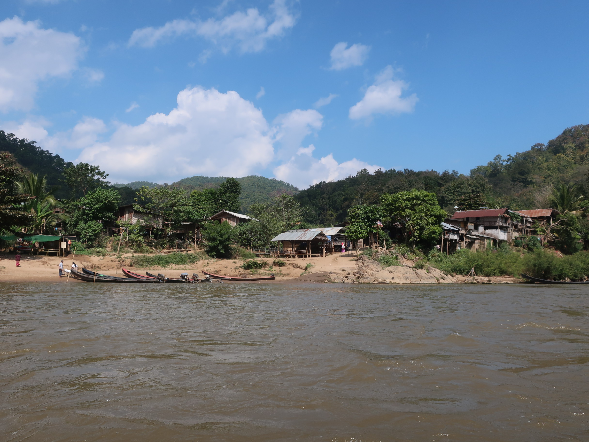 Landsbyen Huay Pu Keng ligger ved floden Pai og måske netop dette faktum, at man er nødt til at krydse floden for at komme til landsbyen, gør, at den virker oprindelig. Det koster 20 THB af blive sejlet over floden pr. person, men så er det også en returbillet. Det slider selvsagt, at vi turister tramper rundt i deres landsby, og der skal derfor også lægges en betaling på 200 THB pr. person, som anvendes til at bygge broer og gangstier i landsbyen. Der er naturligvis ingen motorcykler eller biler. Byen har 335 indbyggere, hvoraf 87 er børn, så der er også en skole. Tilfældigt spiste vi nudelsuppe til frokost sammen med skoleinspektøren, som vi kunne stille alle vores spøgsmål til.