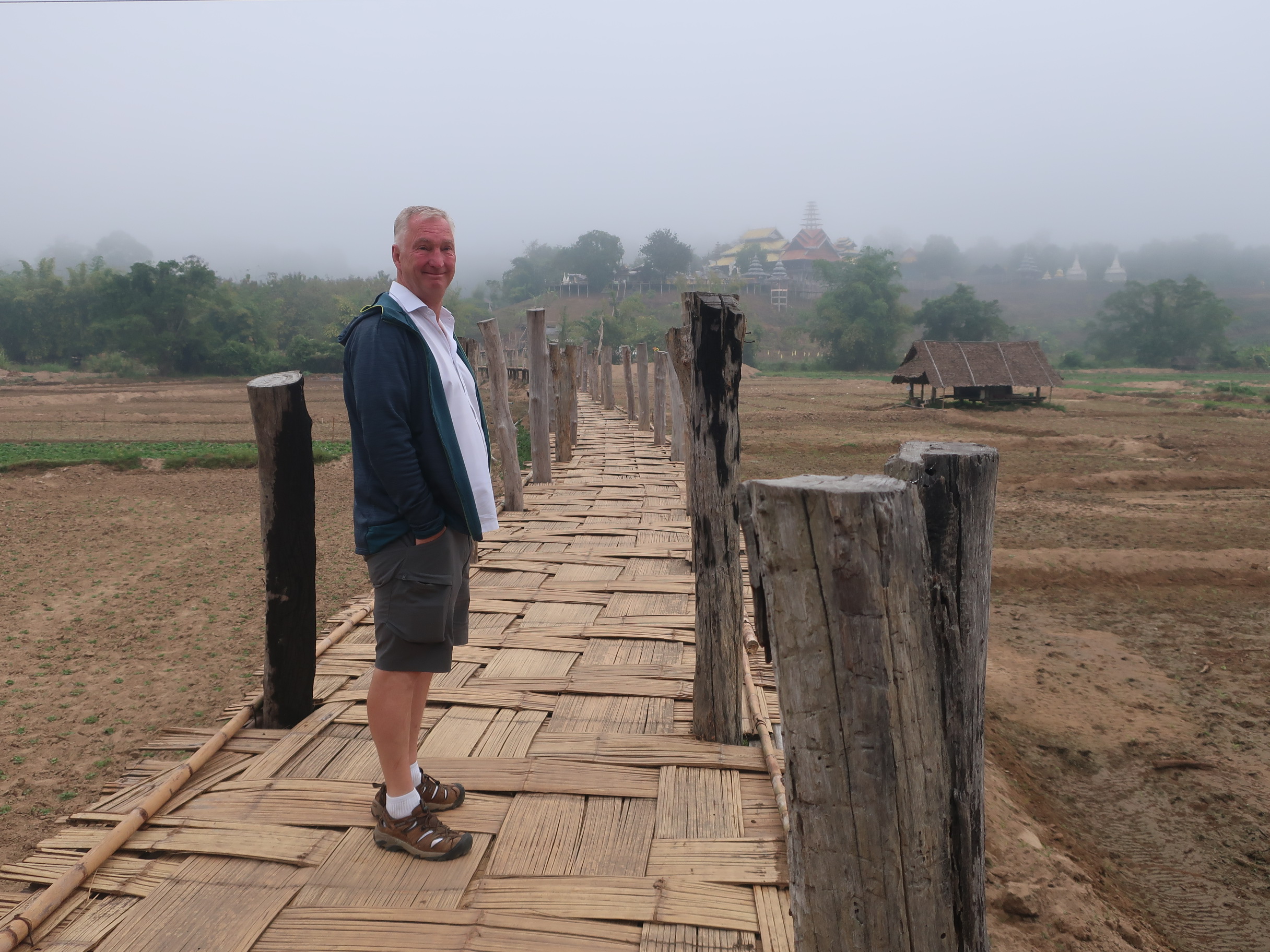 Broen var ikke bare lavet af bambus, men af flettet bambus; den bærende konstruktion var dog lavet af hårdtræ og 2″ jernrør. Den førte fra en landsby tværs over en masse ris- og grøntsagsmarker over til et meget stort tempelkompleks, hvor der var gang i byggeri af alt muligt godt i beton.
