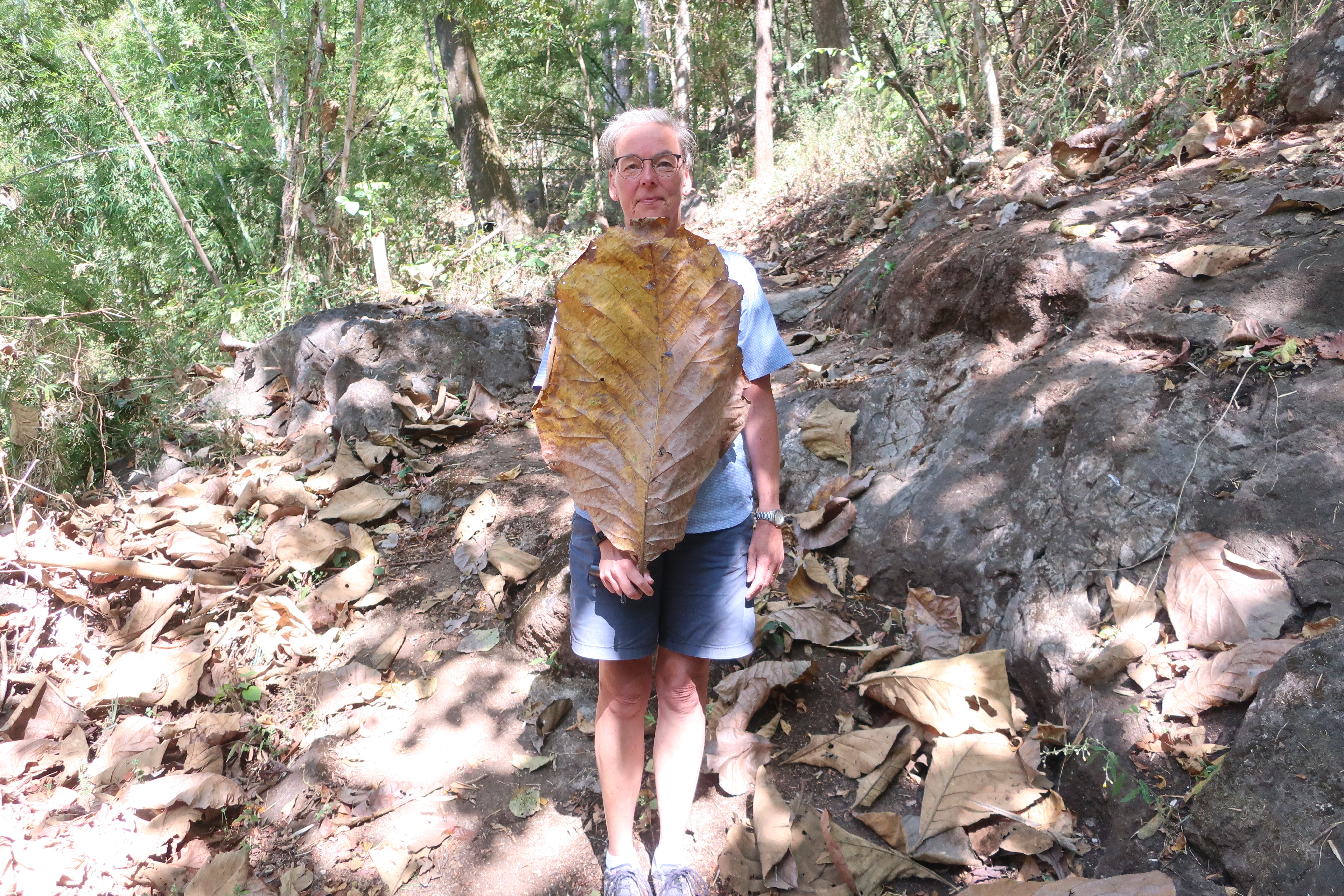 Naturstien fra parkeringspladsen ved grottekomplekset med gamle kister op til selve grotterne var for en gangs skyld jævn ligesom en dansk skovsti, og af en eller anden årsag var vi de eneste på stedet. Det eneste, vi skulle træde henover, var nedfaldsblade, men som billedet viser, så er et blad i Thailand lidt større, end dem vi har i Danmark.