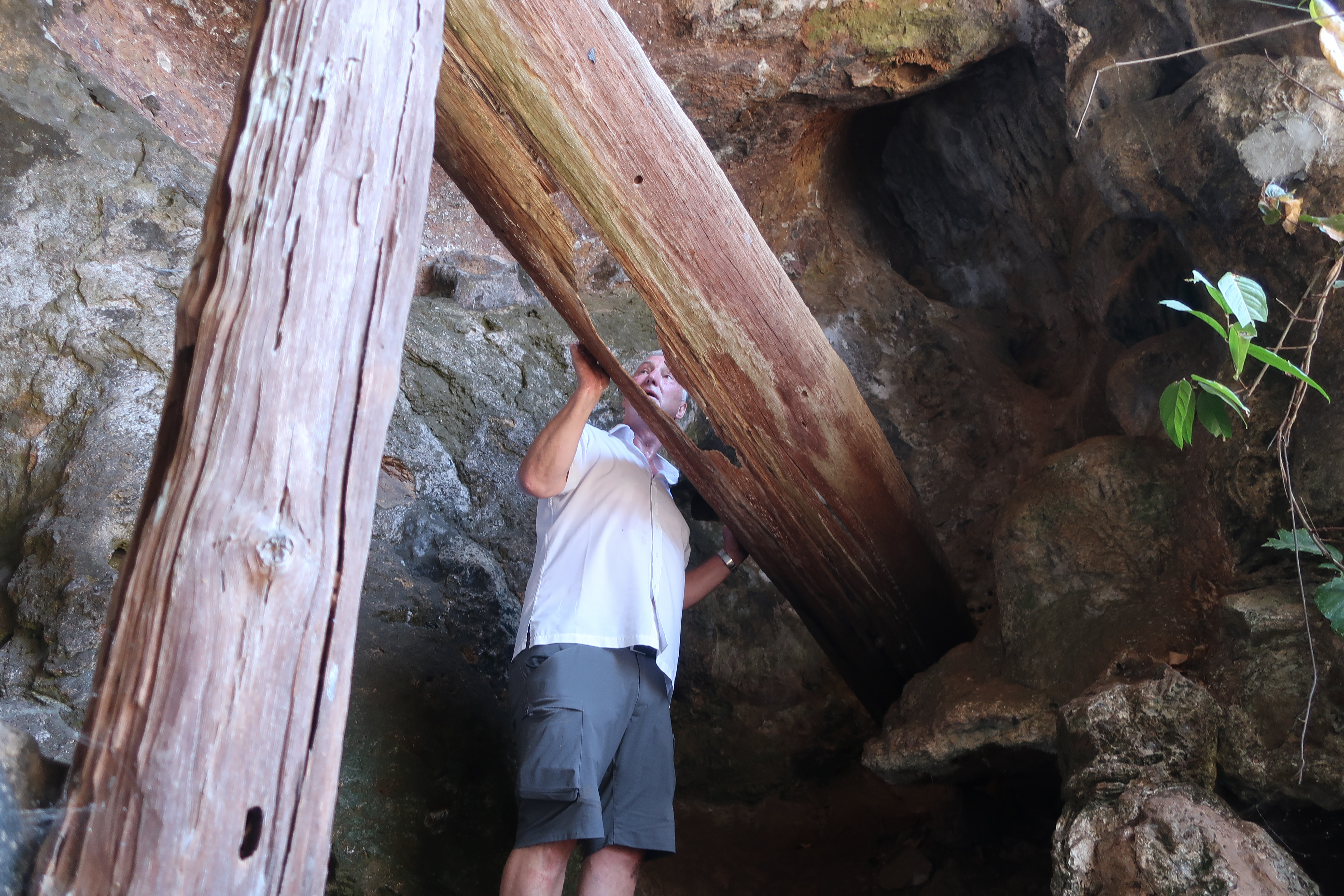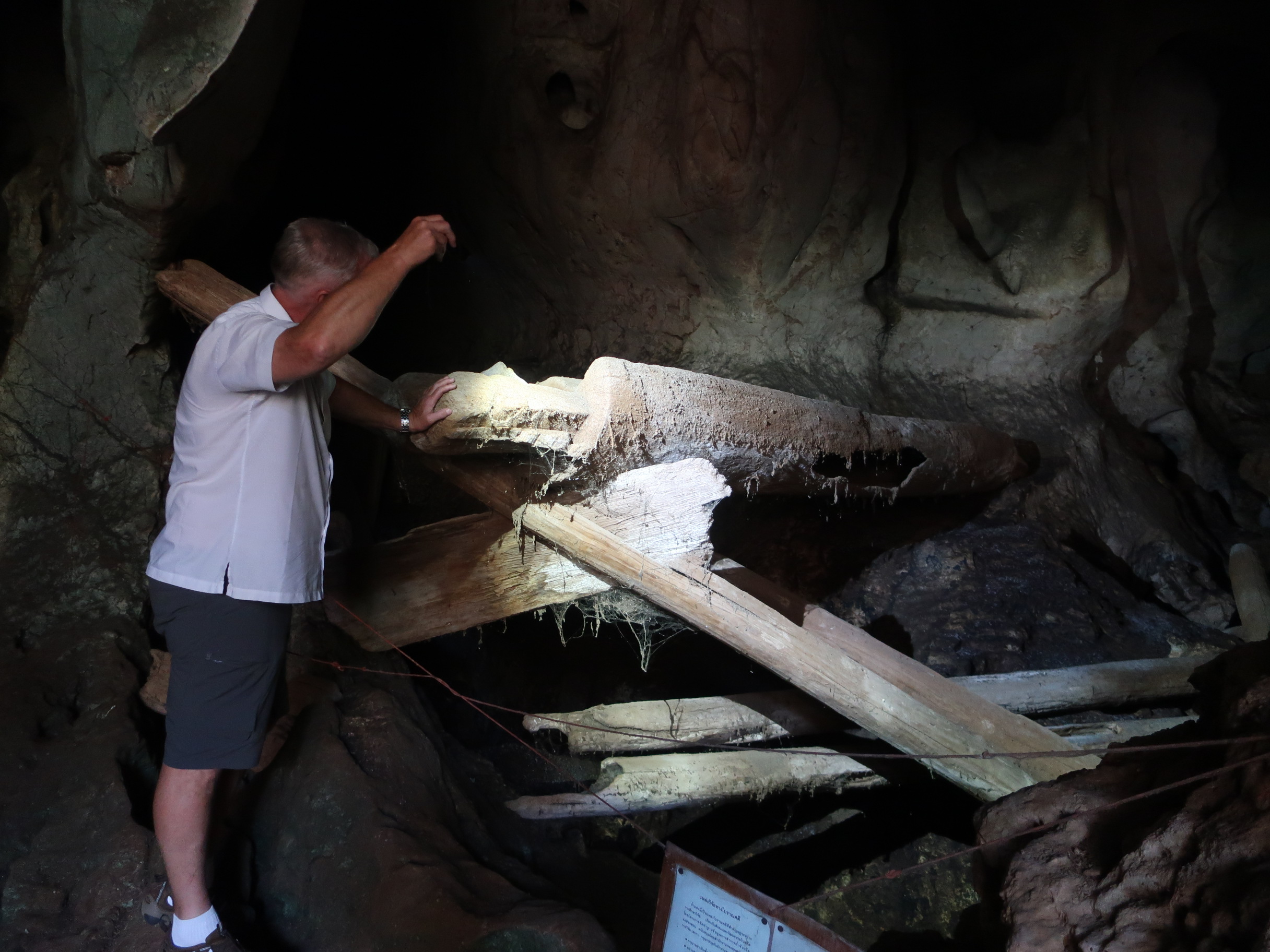 Kisterne var oprindeligt båret af en større trækonstruktion inde i grotten. Det er svært at se, om der har været fem eller 20 kister liggende ved siden af hinanden, men på billedet kan man se en enkelt kiste samt det, der er tilbage af den bærende konstruktion. Man skal her huske, at disse grotter ligger ca. 100 meter over terræn, og kisterne er 5-6 meter lange (måske med flere lig i samme kiste?), så det har været noget af en bedrift at etablere disse gravpladser. Vi gætter på, at det kun har været for de mest betydningsfulde i stammen.