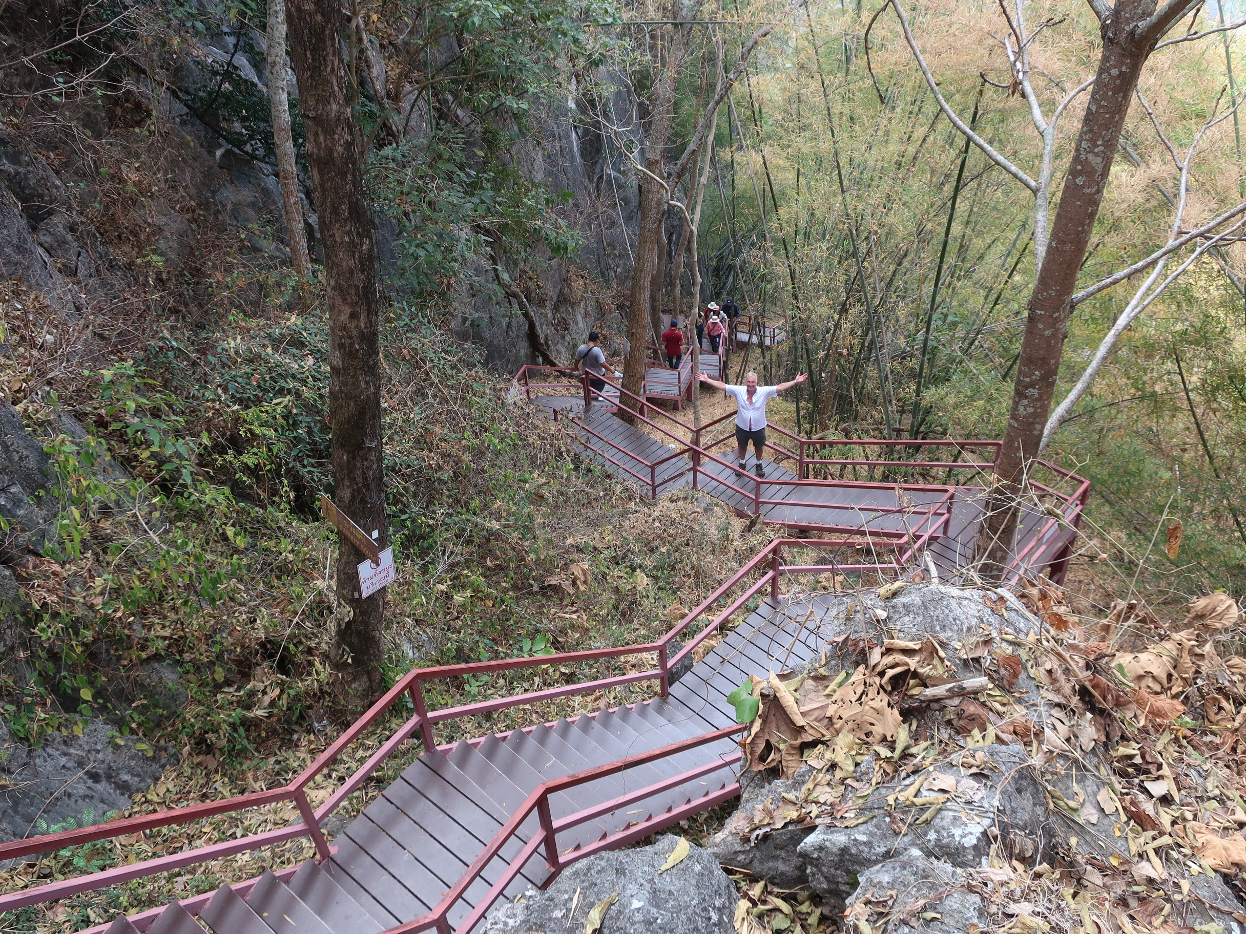 Lampang er en temmelig flad provins, hvor der bliver dyrket en masse grøntsager og ris, men på vejen mod Chiang Mai dukker der alligevel nogle bjerge og dermed kløfter op. Togbanen er naturligvis forsøgt ført så lige som muligt for at spare både tid og penge i forbindelse med konstruktionen, så på et enkelt stræk havde vi fornøjelsen af at skulle over nogle høje broer. Når man rejser på tredje klasse, er der selvfølgelig ingen aircondition, men til gengæld kan vinduerne åbnes, så man bedre kan filme ud af vinduerne😀