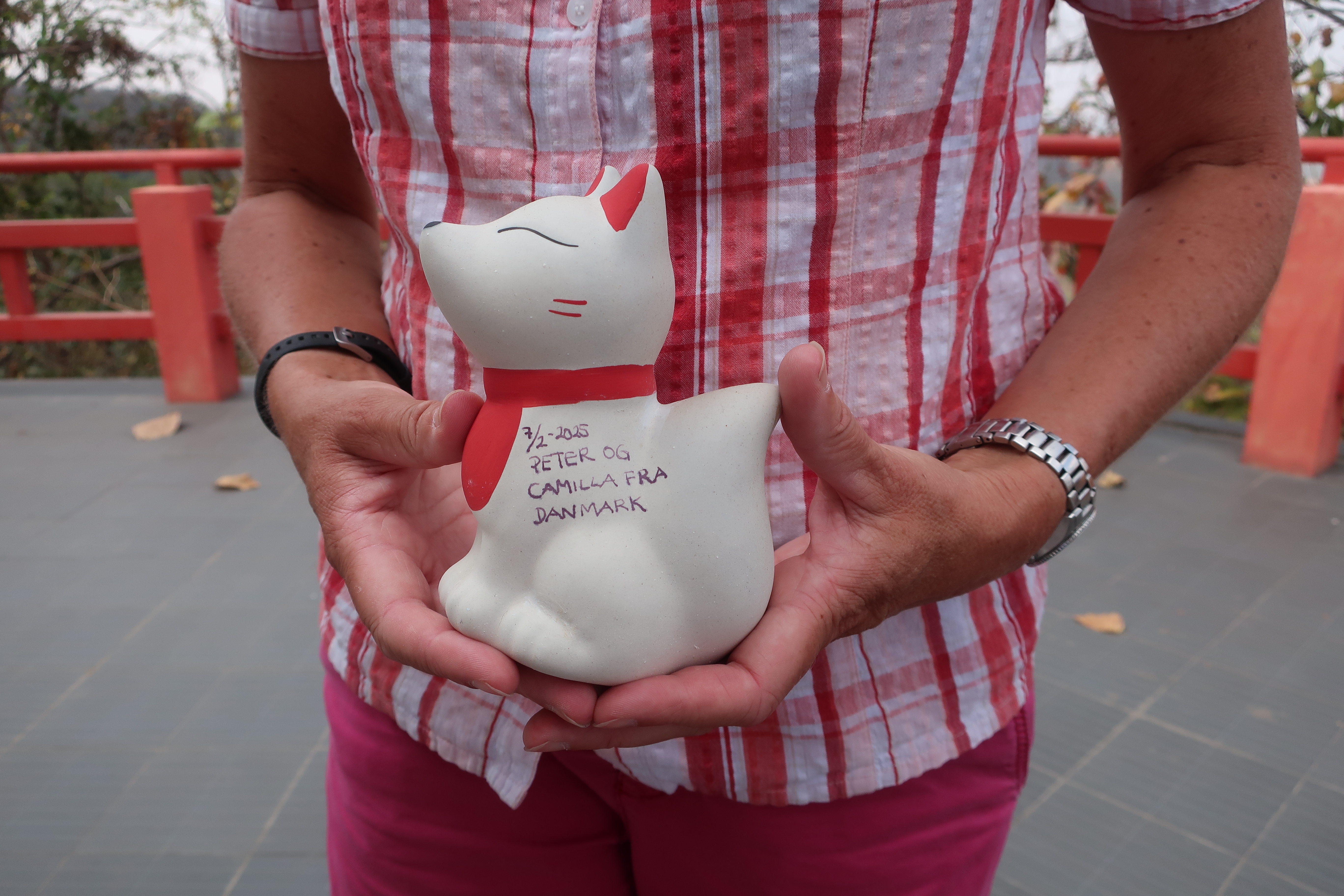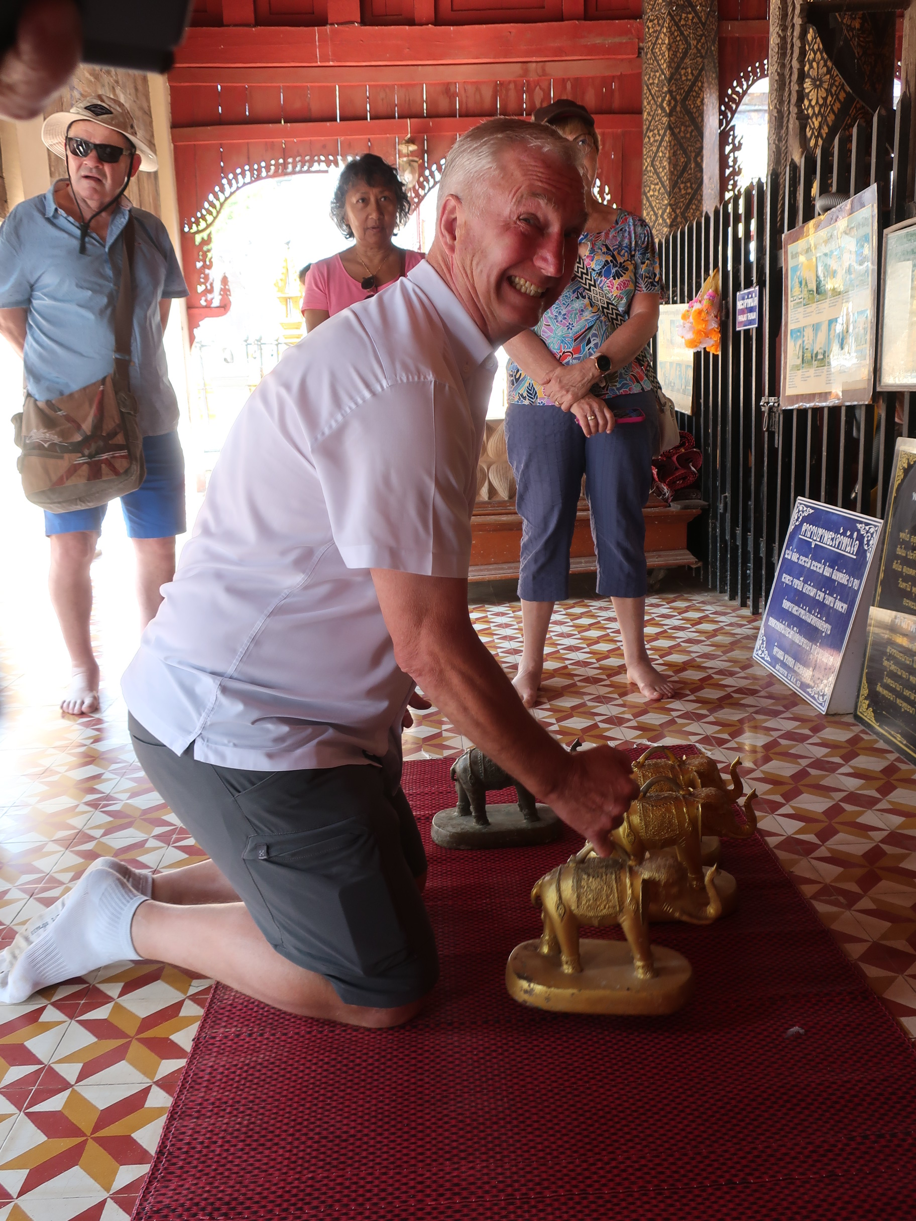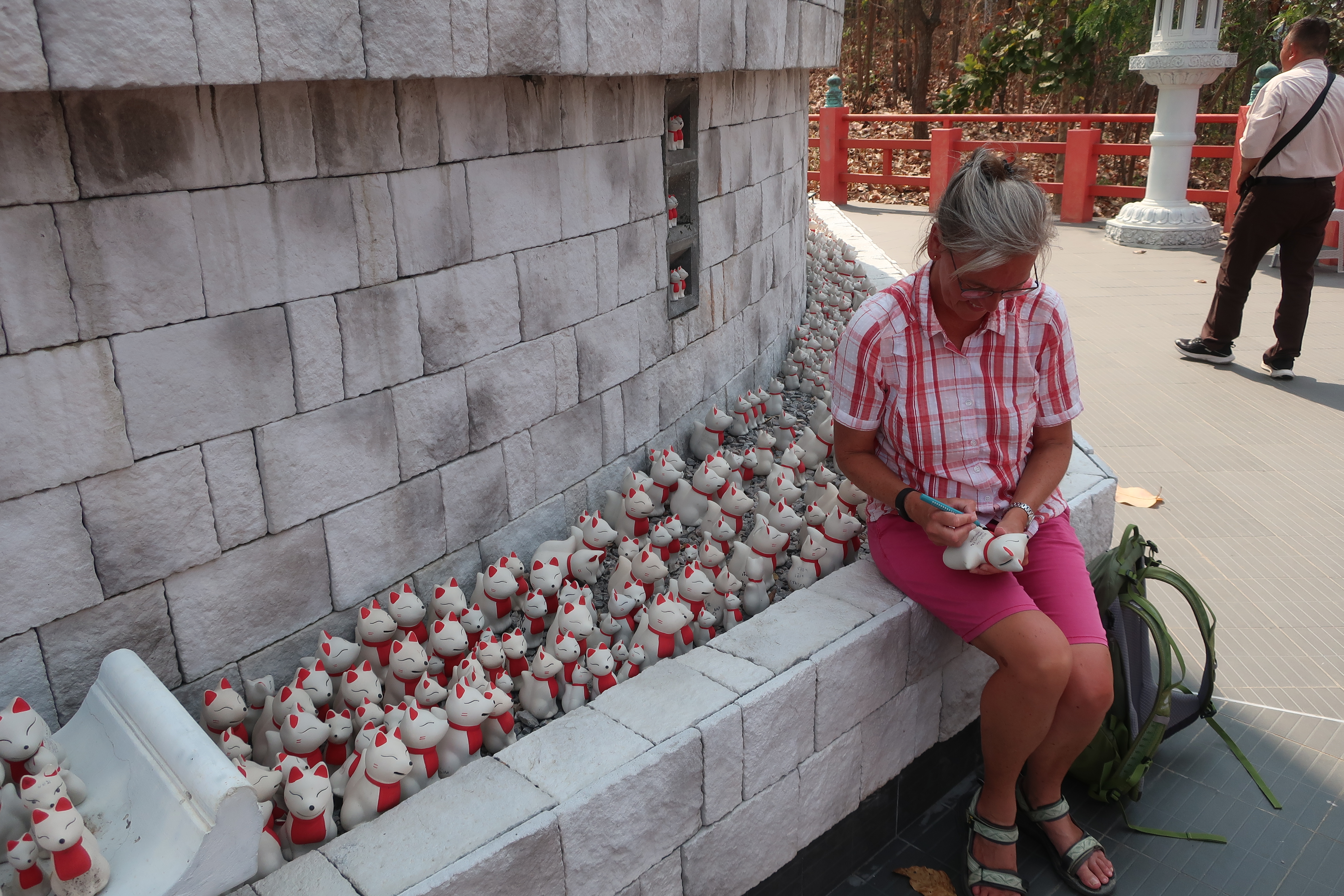 Wat Prathat Lampang Luang set udefra. Thaier og i det hele taget buddhister har mange måder at få svar på deres fremtid. En af måderne er, at man i wat’er finder disse elefanter. Princippet er, at man laver et ønske til Buddha og derefter løfter elefanten (den vejer ca. to kg) med højre hånds lillefinger. Derefter beder man en bøn om, at det, man ønsker, skal gå i opfyldelse. Hvis man trods alle anstrengelser ikke kan løfte elefanten anden gang, vil ens ønske gå i opfyldelse. Hvis man ikke er troende gælder ovennævnte selvsagt ikke. Som Peters ansigtsudtryk afslører, fik han ikke sin bøn opfyldt😀.Det er ikke kun Buddha, der bliver bedt til i templer. Nuværende og afdøde munke indtager også en høj position, og det er helt almindeligt, at der hænger fotografier af flere munke i både private hjem og forretninger. Her er tre munke blevet foreviget som plastafstøbninger i naturlig størrelse, og de var meget virkelighedstro. Guld & glimmer er altid godt.Dagens anden wat, Wat Prathat Doi Prachan, ligger på en bjergtop, som man enten kan gå op til eller betale 20 thb for at blive kørt op til på ladet af en pick-up. Husk! at gemme billetten, når du er kommet op, for ellers får du lov til at gå ned.Efter at have set et utal af guldbelagte eller guldmalede Buddhaer var det forfriskende at se en udført i kobber. Naturligvis skinner den ikke på samme måde som guld, men til gengæld er irbelagt kobber jo bestemt også smukt.Buddhisme og katolicisme har bestemt ikke noget med hinanden at gøre, men ét sted har de samme holdning: kan vi få en troende til at smide en skilling for syndsforladelse eller for at få et ønske opfyldt, så gør de det. Vi har set det i forhold til buddhisme i mange lande, og på dette tempel kunne man så skrive noget på en porcelænskat, der samtidig var en sparegris (underforstået: put penge i mig), og dermed få et ønske opfyldt.Camilla valgte i denne situation at tømme lommerne for mønter og skrive en lille hilsen fra Danmark.