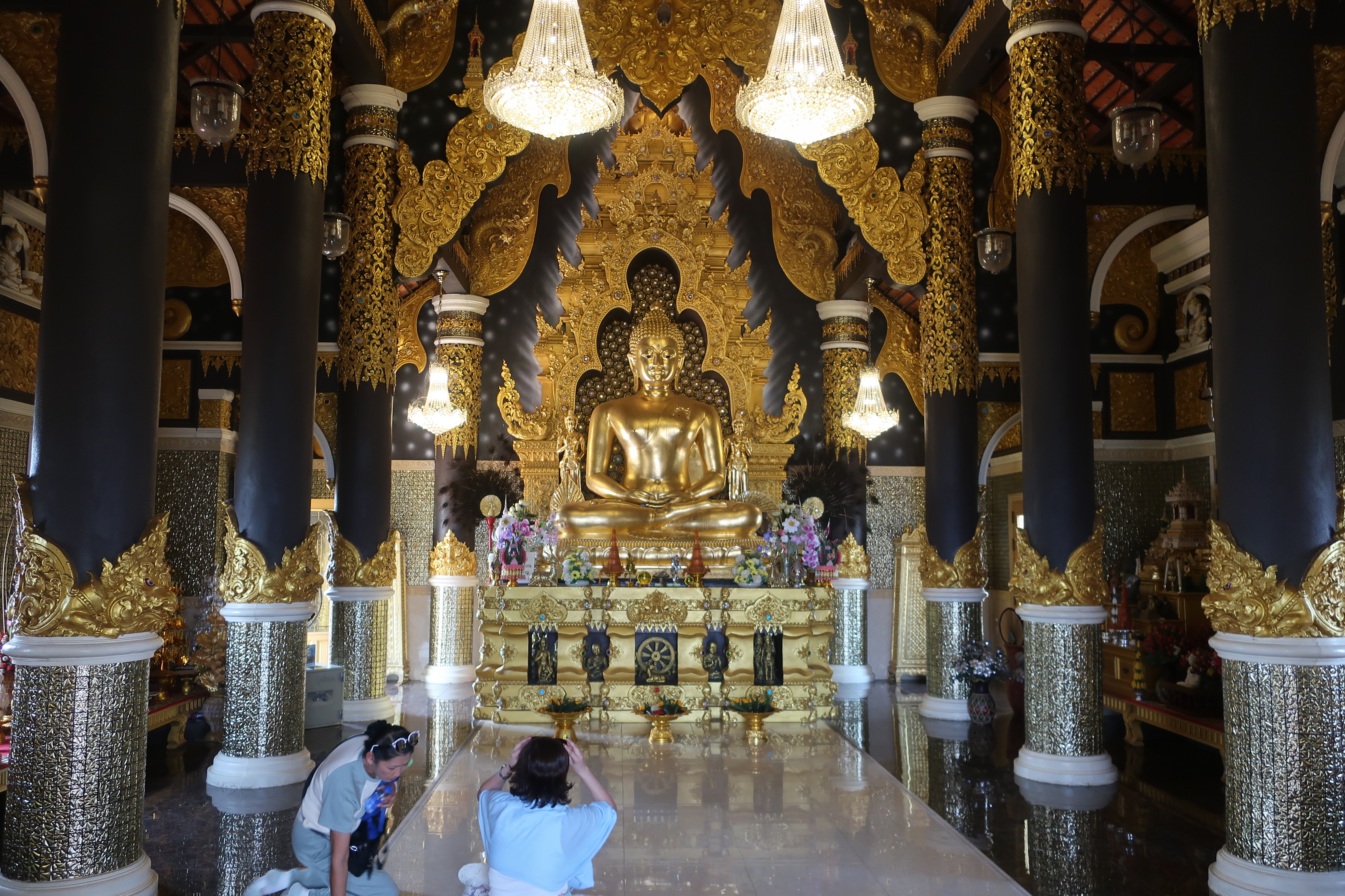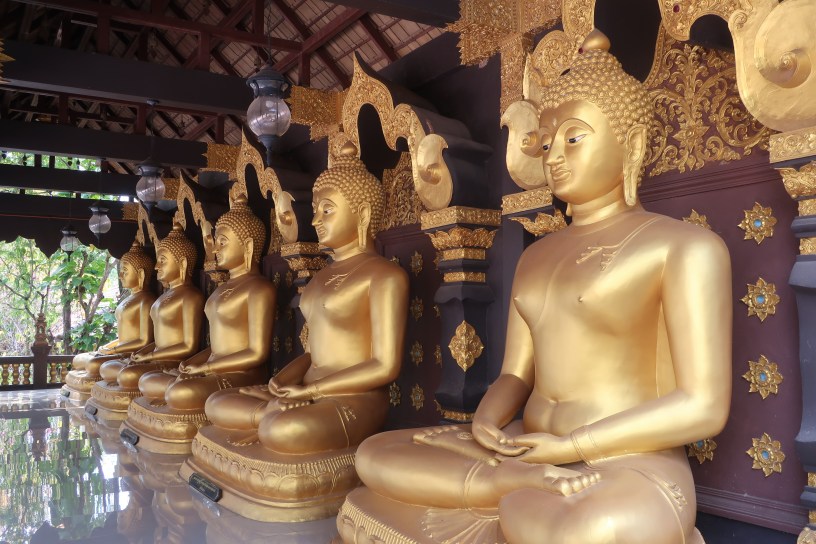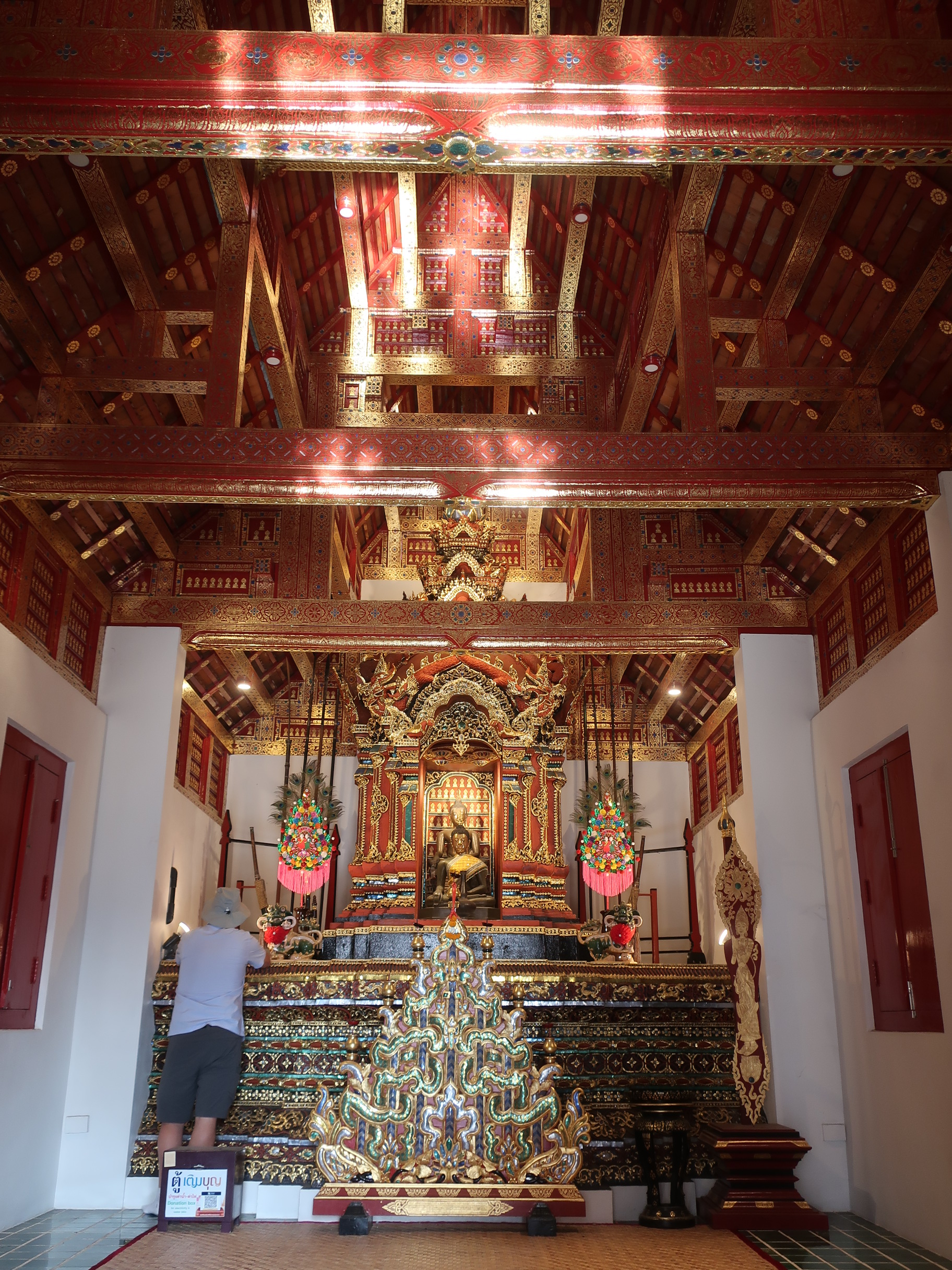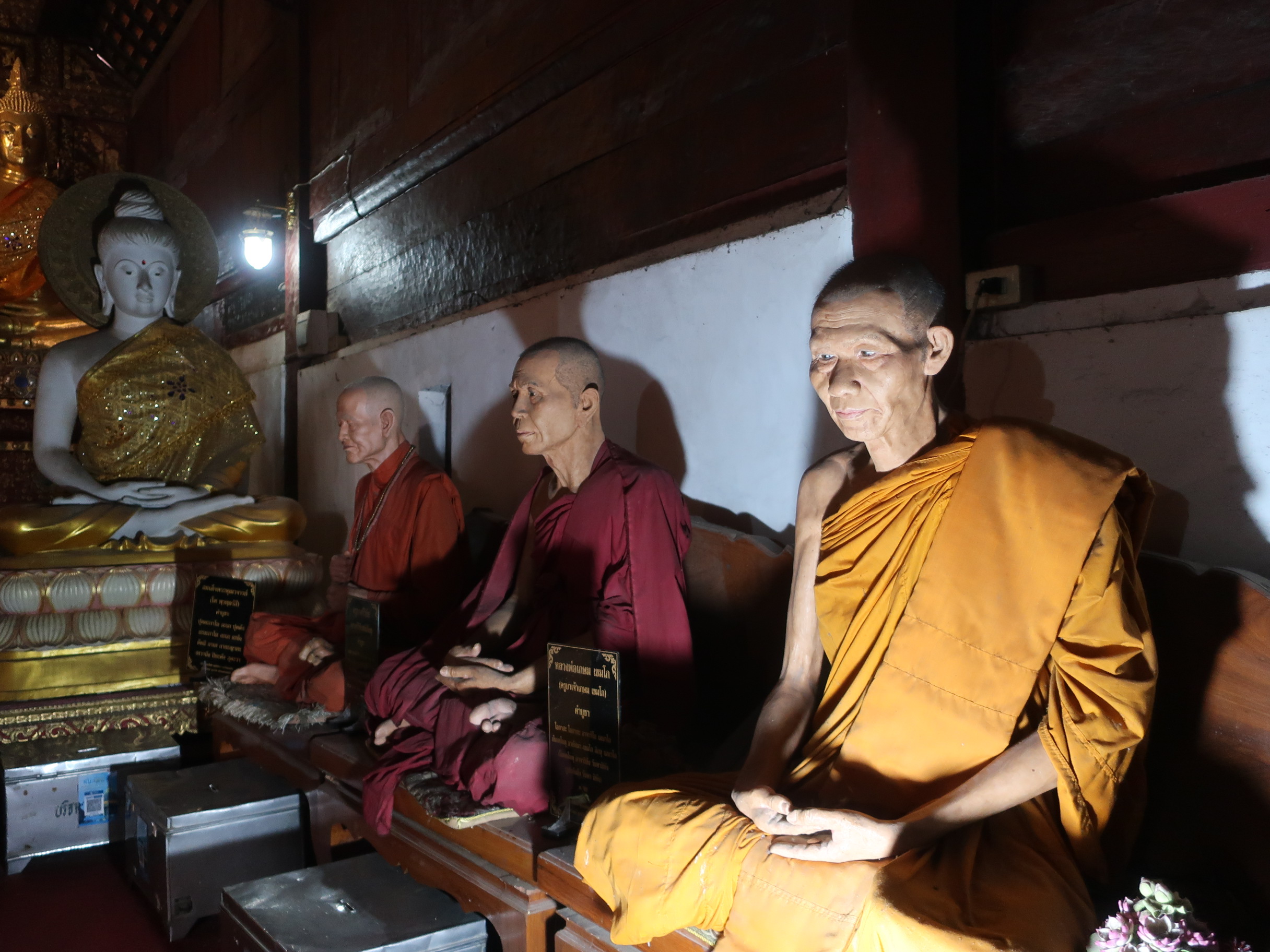 Wat Prathat Lampang Luang set udefra. Thaier og i det hele taget buddhister har mange måder at få svar på deres fremtid. En af måderne er, at man i wat’er finder disse elefanter. Princippet er, at man laver et ønske til Buddha og derefter løfter elefanten (den vejer ca. to kg) med højre hånds lillefinger. Derefter beder man en bøn om, at det, man ønsker, skal gå i opfyldelse. Hvis man trods alle anstrengelser ikke kan løfte elefanten anden gang, vil ens ønske gå i opfyldelse. Hvis man ikke er troende gælder ovennævnte selvsagt ikke. Som Peters ansigtsudtryk afslører, fik han ikke sin bøn opfyldt😀.Det er ikke kun Buddha, der bliver bedt til i templer. Nuværende og afdøde munke indtager også en høj position, og det er helt almindeligt, at der hænger fotografier af flere munke i både private hjem og forretninger. Her er tre munke blevet foreviget som plastafstøbninger i naturlig størrelse, og de var meget virkelighedstro. Guld & glimmer er altid godt.Dagens anden wat, Wat Prathat Doi Prachan, ligger på en bjergtop, som man enten kan gå op til eller betale 20 thb for at blive kørt op til på ladet af en pick-up. Husk! at gemme billetten, når du er kommet op, for ellers får du lov til at gå ned.Efter at have set et utal af guldbelagte eller guldmalede Buddhaer var det forfriskende at se en udført i kobber. Naturligvis skinner den ikke på samme måde som guld, men til gengæld er irbelagt kobber jo bestemt også smukt.Buddhisme og katolicisme har bestemt ikke noget med hinanden at gøre, men ét sted har de samme holdning: kan vi få en troende til at smide en skilling for syndsforladelse eller for at få et ønske opfyldt, så gør de det. Vi har set det i forhold til buddhisme i mange lande, og på dette tempel kunne man så skrive noget på en porcelænskat, der samtidig var en sparegris (underforstået: put penge i mig), og dermed få et ønske opfyldt.Camilla valgte i denne situation at tømme lommerne for mønter og skrive en lille hilsen fra Danmark.