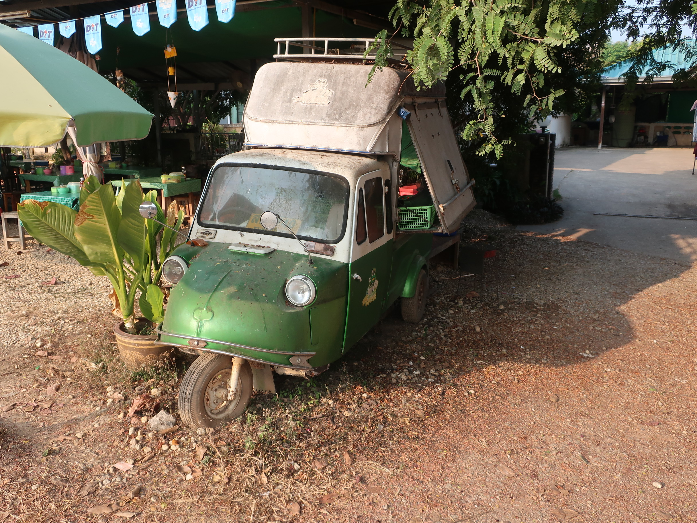 Der var bl.a. et hus ud mod vejen, hvor der stod otte store væve, hvor der var gang i produktion af forskellige stykker stof. De var alle helt forskellige, men alle meget smukke og helt sikkert bestillingsarbejder.Det er ligeledes helt normalt, når vi turer rundt på motorcykel, at vi ser gamle biler og motorcykler. Nogle er virkelig flot renoveret, andre står bare og får os til at blive nysgerrige. Her er vi stoppet ved en Daihatsu Trimobile fra 60erne på 305 cc tocylinderet aircoolet. Max hastighed: 60 km i timen. Hvis du vejer mere end 60 kg, kommer du måske ind i kabinen, men ikke ud igen.
